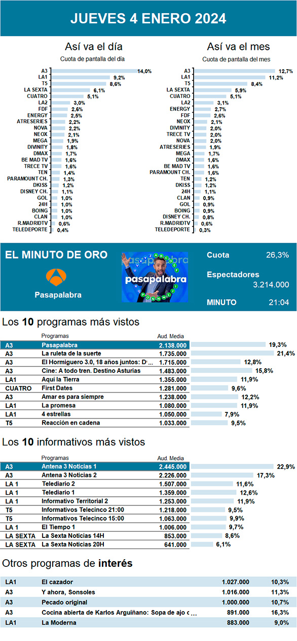 AUDIENCIAS: JUEVES 4 DE ENERO DE 2024