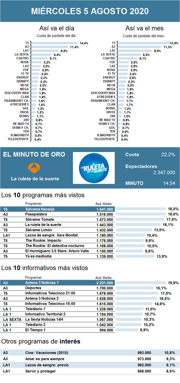 Este miércoles, Lazos de sangre retomó el liderazgo nocturno con un programa centrado en Sara Montiel. Sin embargo, pese a su mejora con respecto a la semana pasada, el espacio de La 1 no logró una audiencia mucho mayor que su principal rival, Telecinco.