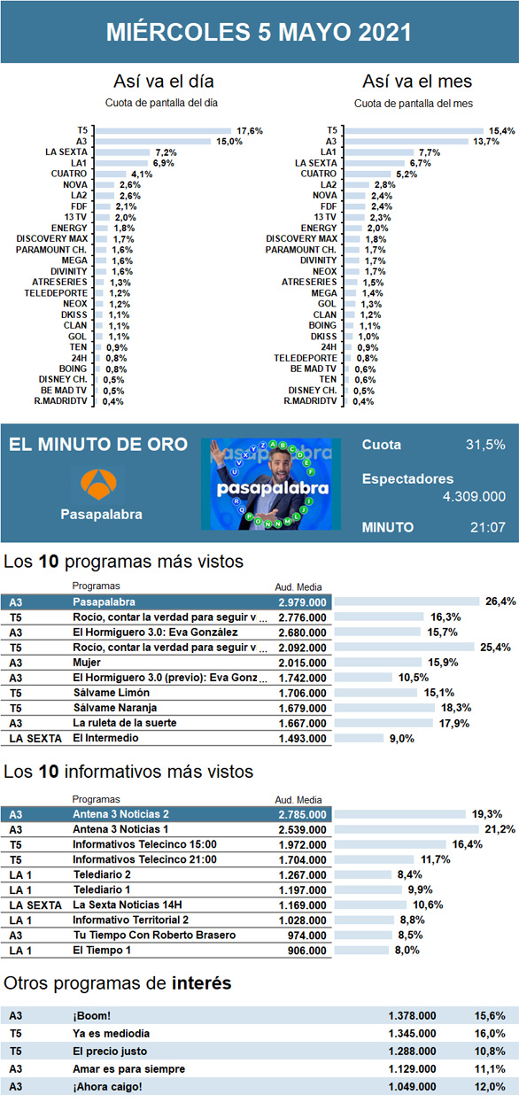 AUDIENCIAS: MIÉRCOLES 5 DE MAYO DE 2021