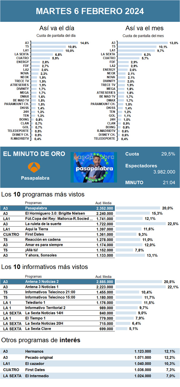 AUDIENCIAS: MARTES 6 DE FEBRERO DE 2024
