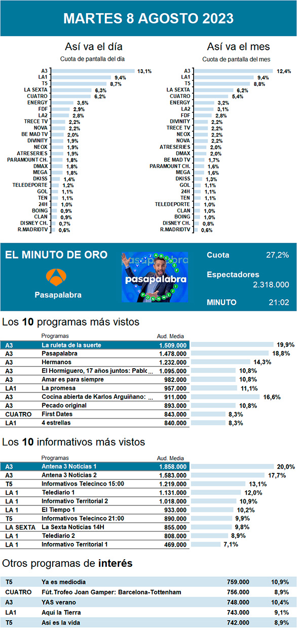 AUDIENCIAS: MARTES 8 DE AGOSTO DE 2023
