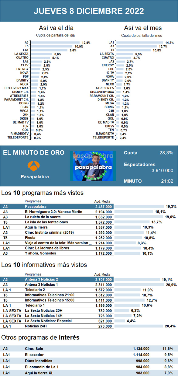 AUDIENCIAS: JUEVES 8 DE DICIEMBRE DE 2022