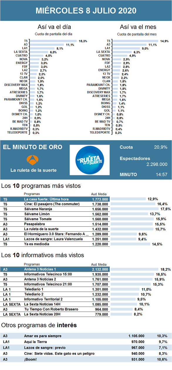 De este modo, La 1 ocupó el segundo puesto de la noche con Lazos de sangre. Mientras, la apuesta cinematográfica de Antena 3 quedó relegada a tercera opción con Siete vidas. Este gato es un peligro.