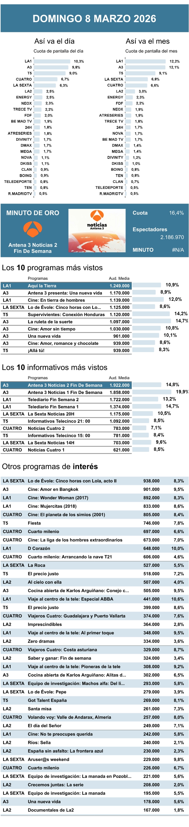 AUDIENCIAS: DOMINGO 8 DE MARZO DE 2026