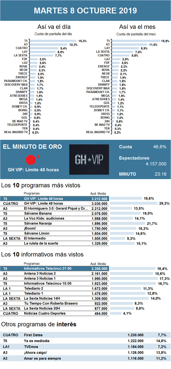 AUDIENCIAS: MARTES 8 DE OCTUBRE DE 2019