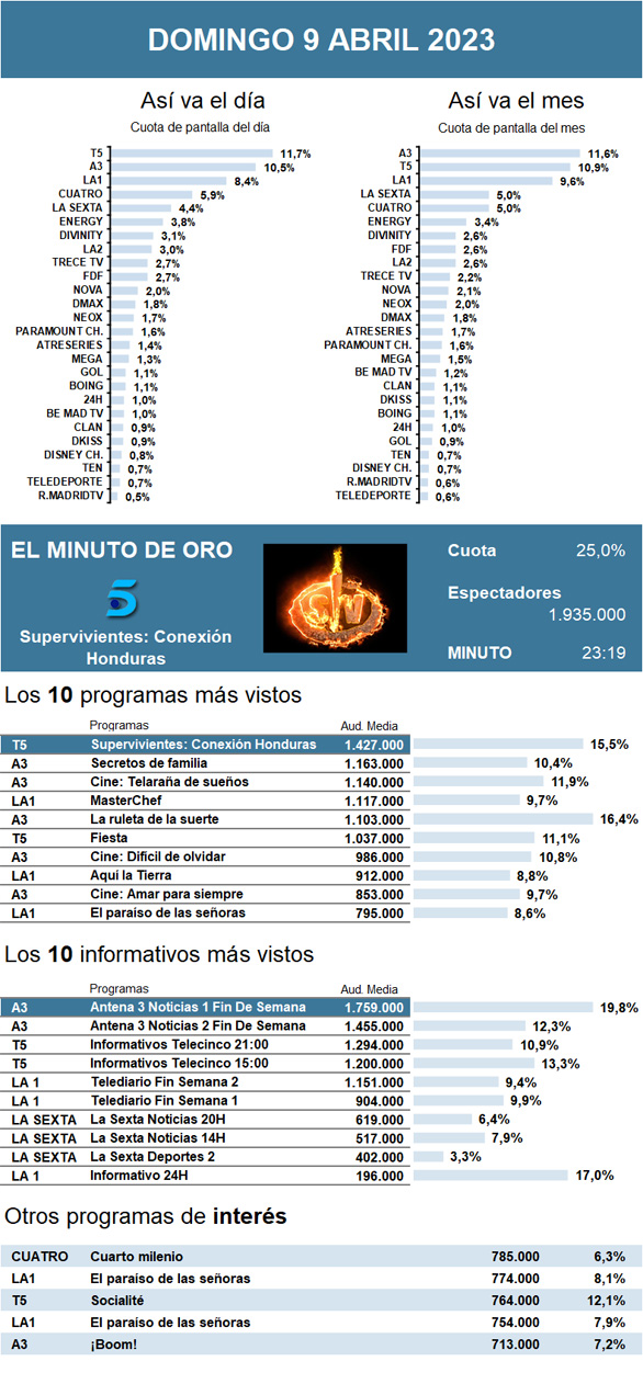 AUDIENCIAS: DOMINGO 9 DE ABRIL DE 2023