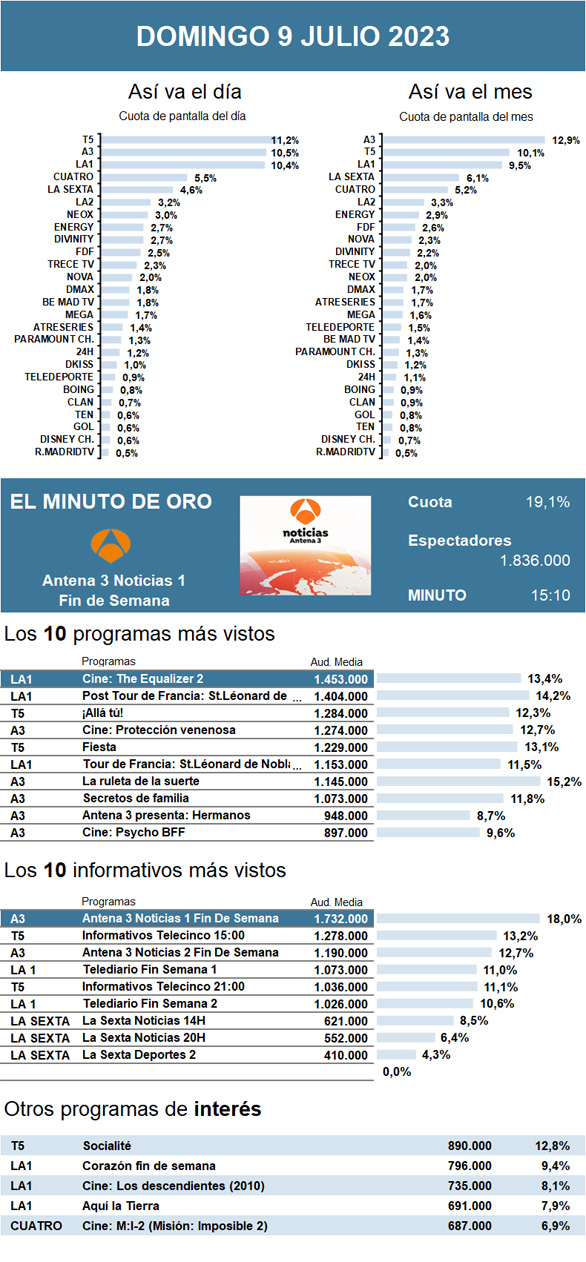 AUDIENCIAS: DOMINGO 9 DE JULIO DE 2023