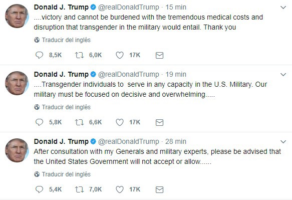 "El Gobierno de Estados Unidos no aceptará ni permitirá que personas transgénero sirvan en ninguna capacidad de las Fuerzas Armadas", explica Trump, a lo que añade que los militares "no puede ser cargados con los enormes costes médicos y la interrupción que implica que haya transexuales en el Ejército".