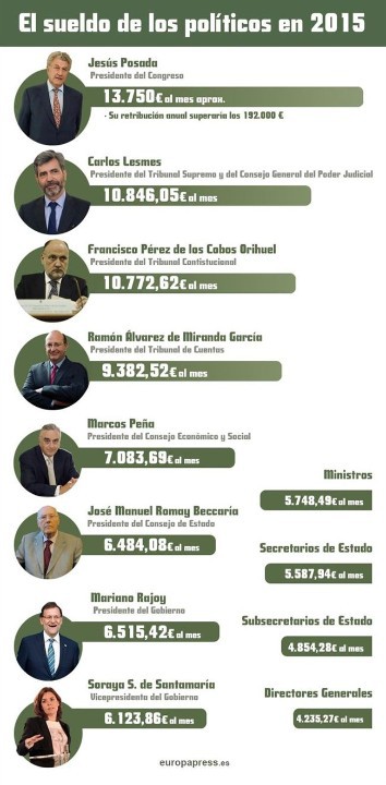 Por encima de todos ellos está el presidente del Congreso, que percibe mensualmente unos 13.750 euros incluyendo la asignación económica de cada diputado más el complemento como miembro de la Mesa del Congreso, la ayuda por ser diputado fuera de Madrid y el dinero para gastos de representación y de libre designación, todo ello multiplicado por 14. En total, su retribución anual supera los 192.000 euros.