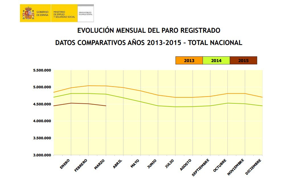 El Servicio Público de Empleo Estatal informa de que el paro registrado se ha situado en 4.451.939: "En marzo de 2014 el desempleo bajó en 16.620 parados en relación al mes anterior. Por otra parte, respecto a marzo de 2014, el paro se ha reducido en 343.927 personas (-7,17 por ciento)". En términos