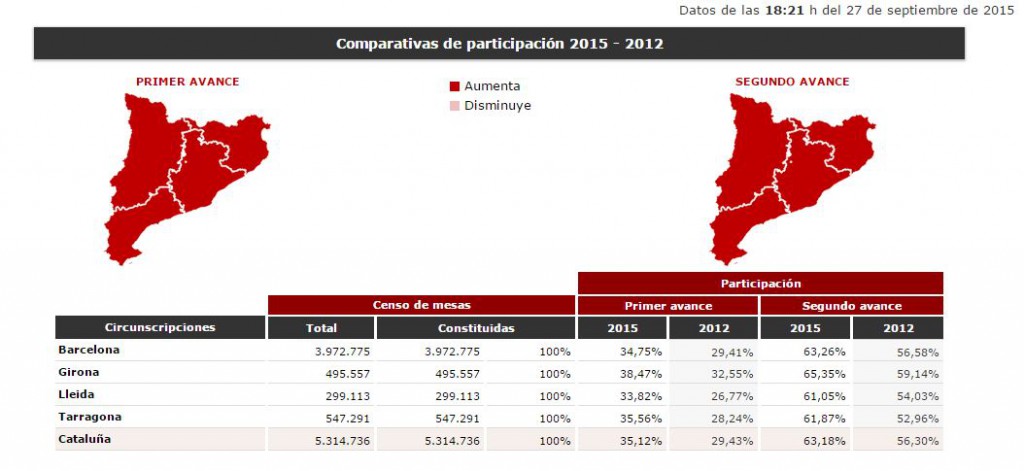 Por circunscripciones, la provincia de Gerona ha sido la que ha registrado una mayor participación, con el 78,2% del censo, un 9 por ciento más que en 2012, seguida de Barcelona, con un 76,9% y Lleida con un 76,4% de electores que han ejercido su voto, un 9% y un 9,6% más, respectivamente, que en los últimos comicios.