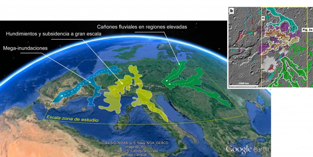 Para ilustrar las dimensiones de las meg-inundaciones de Marte, los investigadores de la UAB han estimado el territorio de Europa que se vería afectado por estos fenómenos, cuantificándolo en unos 2.500.000 km2.