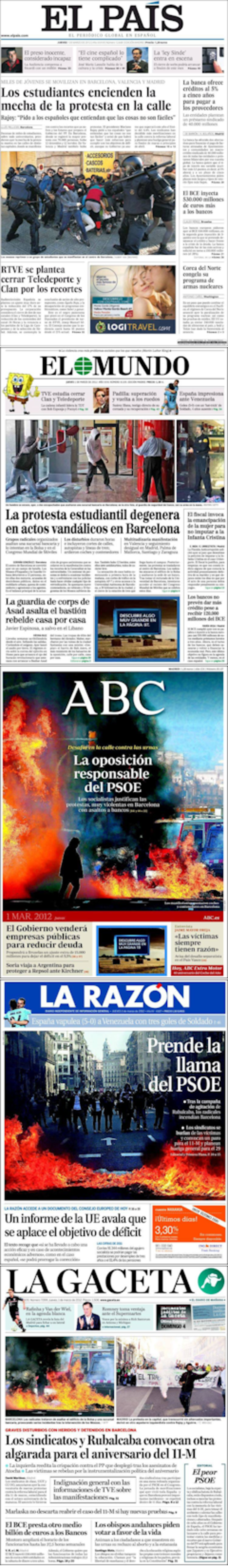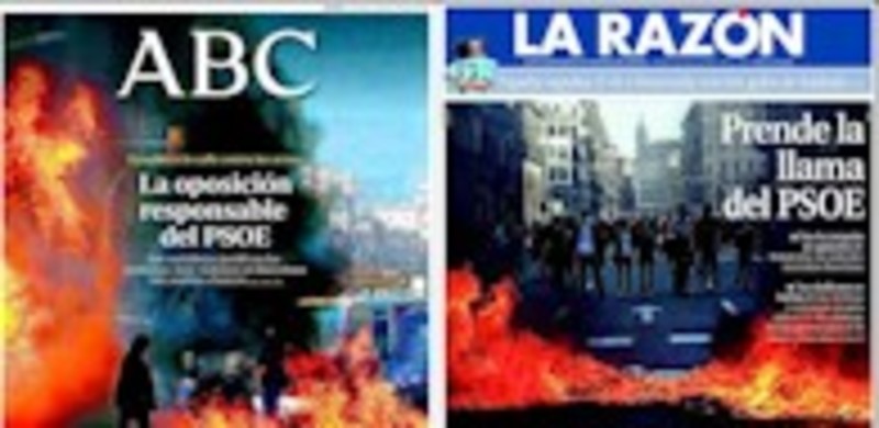 La Razón dedica su portada a los radicales que incendiaron este miércoles Barcelona, “tras la campaña de agitación de Rubalcaba”. El titular es significativo y va en la línea crítica para con los socialistas: 'Prende la llama del PSOE'. Además, el diario de Planeta habla en primera de “los sindicatos que se burlan de las víctimas y convocan un paro para el 11-M y planean huelga general para el 29”. También en portada,