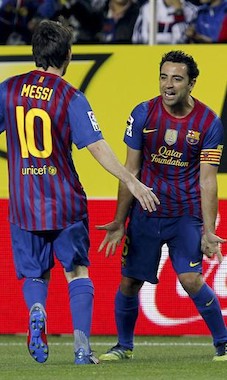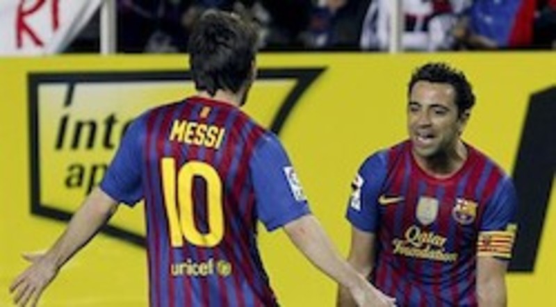 Una falta sobre Adriano del central bosnio Emir Spahic, quien fue duda por lesión hasta minutos antes del choque, fue el preludio del primer gol azulgrana, pues Xavi Hernández se sacó un magnífico lanzamiento libre directo al que no pudo responder Palop.