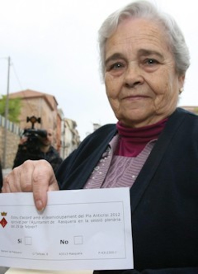 La pregunta a la que tenían que responder los rasqueranos es "¿Estáis de acuerdo con el plan anticrisis aprobado por el Ayuntamiento de Rasquera en sesión plenaria del 29 de febrero?", y del resultado que se obtenga hoy no solo dependía la continuidad del proyecto, sino también la del propio gobierno municipal, que anunció que dimitiría en bloque si la consulta no obtenía el 75% de los votos favorables. Si esto ocurriera, una comisión gestora formada por 7 miembros pasaría a gestionar el gobierno municipal.