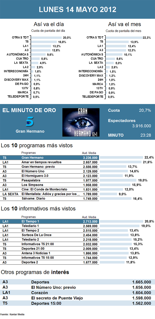 Casi cuatro millones de espectadores se encontraban frente al televisor viendo Gran Hermano 12+1, en Telecinco, anoche a las 23:28 horas durante el minuto de oro, que cosechó un 20,7 por ciento de audiencia. La elección del tercer finalista del concurso también le permitió ser el programa más visto del día con 3,2 millones de seguidores y un 22,4 por ciento de cuota de pantalla, seguido de Amar en tiempos revueltos, de La 1, con 2,6 millones de fieles y un 21,6 por ciento de audiencia y el previo de Gran Hermano, con 2,5 millones y 13,7 por ciento, respectivamente.
