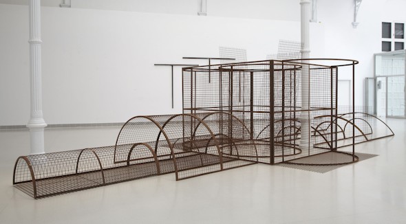 Antes de abandonar el Palacio de Velázquez de camino al Palacio de Cristal conviene centrar la atención en No es la luz que clama en el desierto, elaborada a partir de hierro, cristal y arena. Como si se tratara de una cúpula dada la vuelta, el artista idea una composición ciertamente atrayente, en la que los cristales rotos simulan el agua mientras que los grifos instalados en el perímetro de la estructura circular de hierro parecen verter arena en el suelo. También resulta interesante la obra De trampas y mentiras, que simula una jaula con un pasadizo abovedado en la que las rejas lo invaden todo e impiden el acceso a su interior.