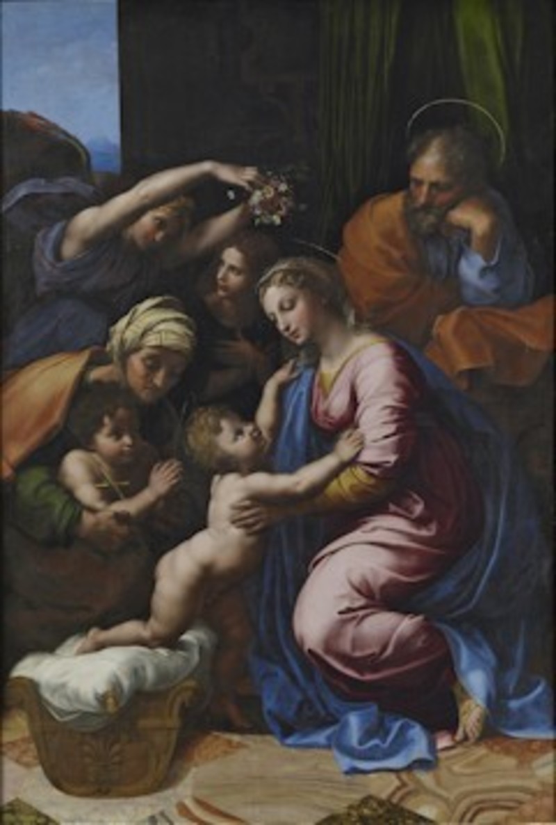 Sagrada Familia de Francisco I, encargada por el Papa León X a Rafael en una estrategia diplomática para servir como presente a Francisco I, rey de Francia. En esta pintura, siete figuras se reparten por en una escena plena de simbolismo dado que la cuna ha sido considerada una prefiguración del sepulcro de
