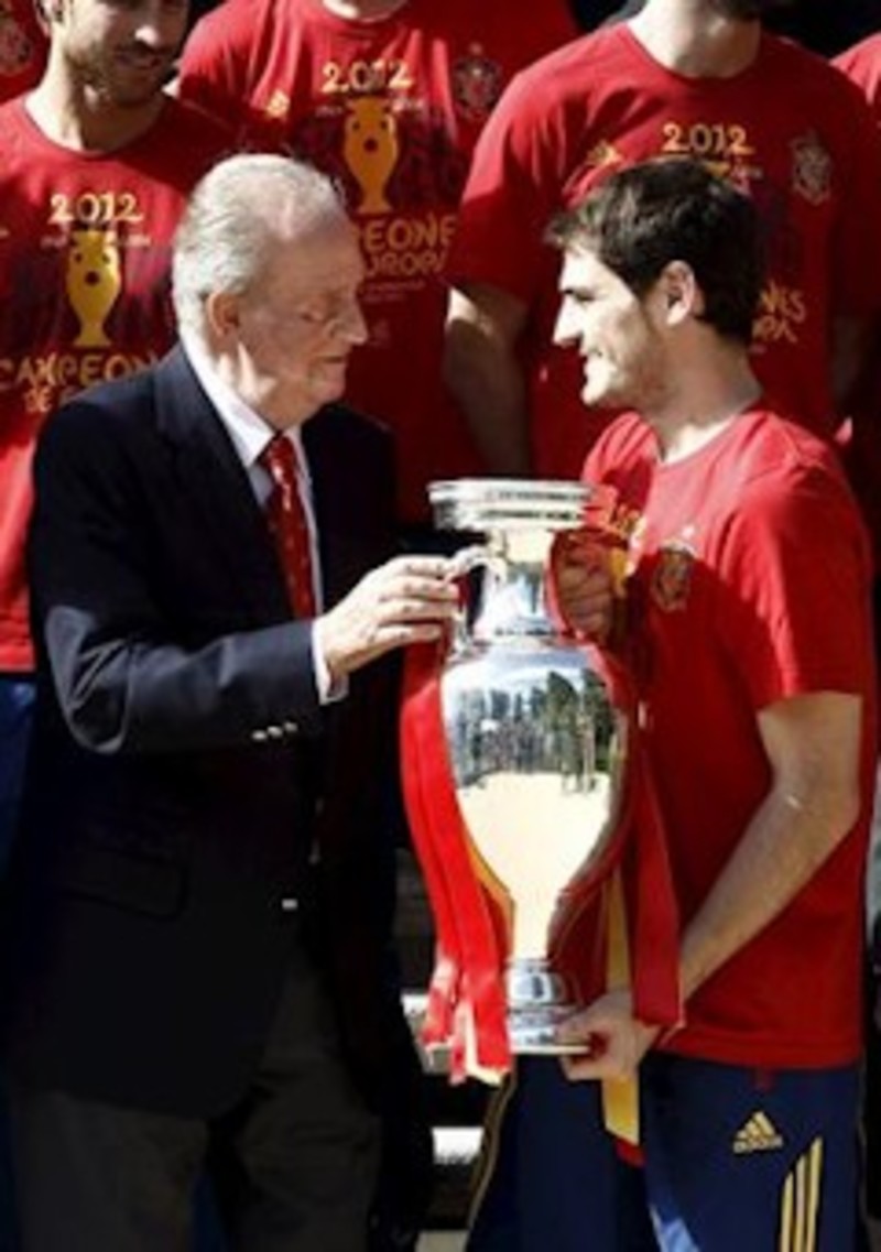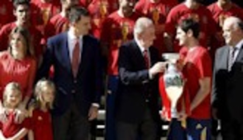 Antes de las palabras del Rey, de Casillas y del ministro de Educación, Cultura y Deporte, José Ignacio Wert, que también quiso felicitar al equipo, los jugadores y el cuerpo técnico fueron recibidos en el 'hall' de Zarzuela por el Rey, los Príncipes de Asturias, la Infanta Doña Elena y las Infantas Leonor y Sofía, que iban perfectamente equipadas con una camiseta de la selección estampada con su nombre.