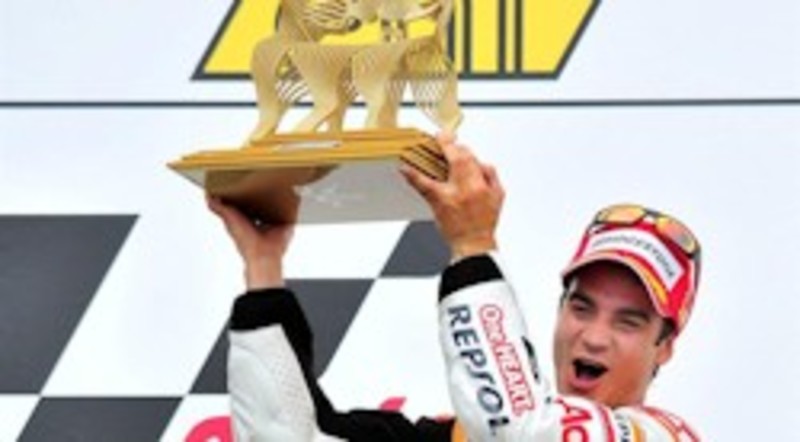 Finalmente, una inoportuna caída de Stoner permitía a Pedrosa consiguir su primera victoria de la temporada en uno de sus circuitos talismán, en el que ha triunfado por tercer año consecutivo, lo que le permite colocarse segundo en la clasificación del Mundial además de recortar distancias con Jorge Lorenzo, líder del campeonato en solitario. Por su parte, Stoner no pudo reincorporarse tras su caída, por lo que cae al tercer lugar en la carrera mundialista.