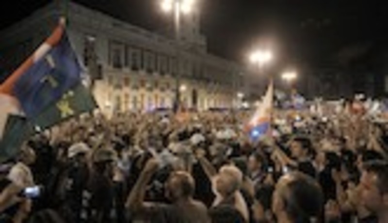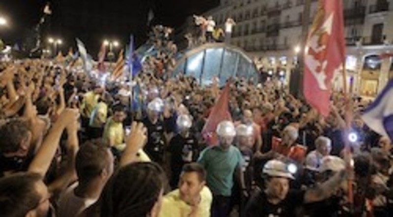 La "marcha negra" toma la Puerta del Sol tras 19 días en ruta. A los 300 mineros llegados a la capital se han unido entre 7.000 y 8.000 personas.