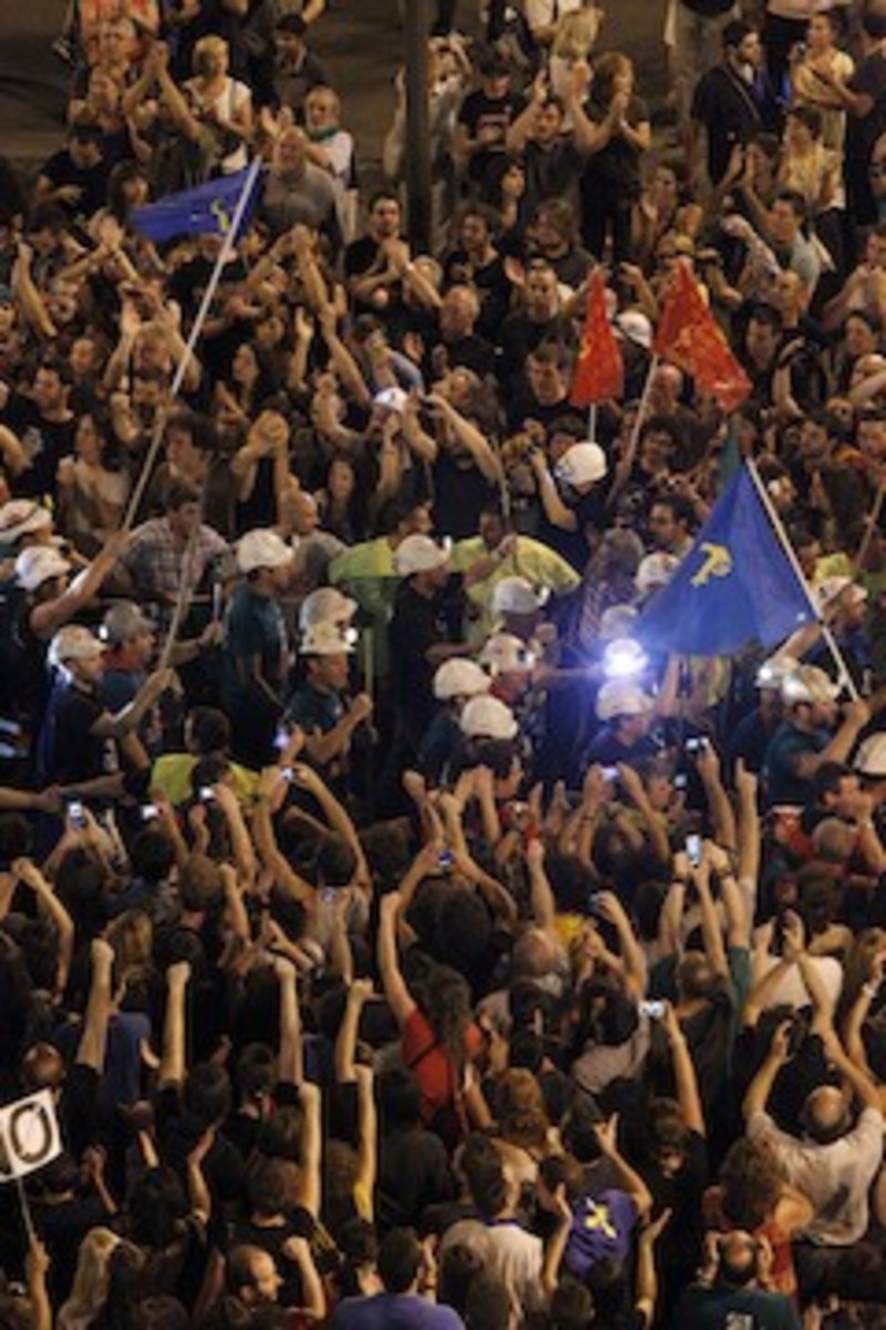 Los mineros de la 'Marcha Negra' han culminado en la Puerta del Sol de Madrid minutos antes de las dos de la madrugada una marcha nocturna por las calles de la capital que ha estado caracterizada por el ambiente festivo y la solidaridad ciudadana, con miles de personas que se han echado a las calles para trasladar su apoyo a los mineros.
