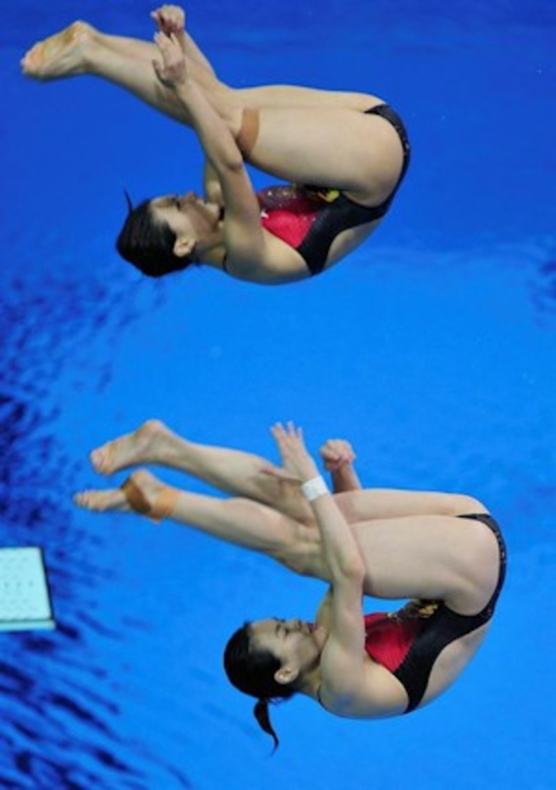 La pareja china sumó 346.20 puntos para doblegar a las estadounidenses Abigail Johnston y Kelci Bryant, medallas de plata con 321.90, y a las canadienses Emilie Heymans y Jennifer Abel, bronce con 316.80.