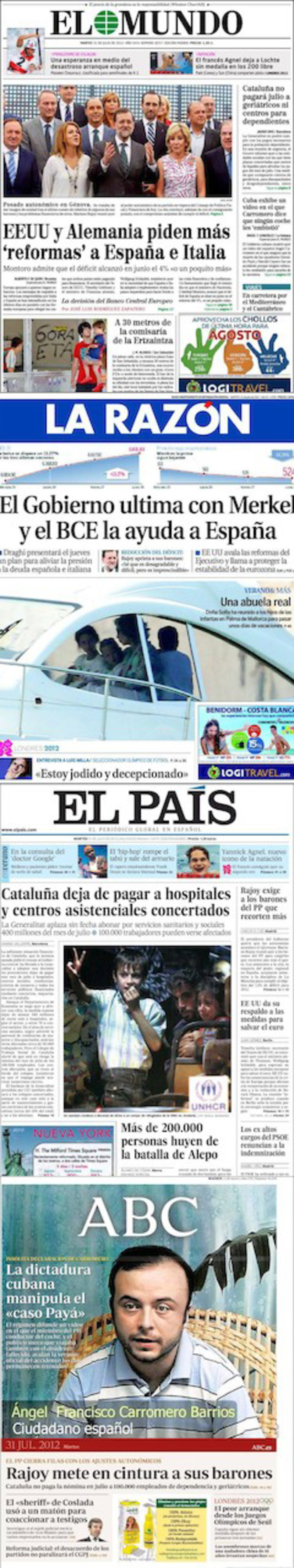 Por su parte, La Razón abre la edición de hoy martes con el titular "El Gobierno ultima con Merkel y el BCE la ayuda a España", al tiempo que señala que Draghi presentará el jueves un plan para aliviar la presión a la deuda española e italiana. La foto de portada es para la familia real. Doña Sofía salió a navergar por primera vez este lunes por aguas de Palma Mallorca junto a sus nietos.