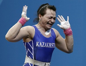 La kazaja levantó 130 en arrancada y 161 en dos tiempos, mientras que Zabolotnaya, la actual plusmarquista mundial, alzó 131 en arrancada y 160 en dos tiempos, en una sesión en que a casi cada levantamiento instauraron una nueva marca olímpica.
