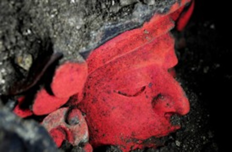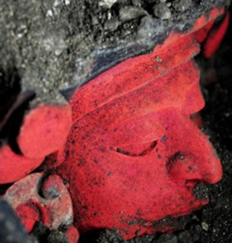 También se descubrió una urna roja con forma de rostro humano con ornamentos como orejeras y un tocado que estaba desprendido y que se encontró a un costado de la pieza, dijo el arqueólogo Eduardo García, al referir que esta pieza formaba parte de la ofrenda mortuoria.