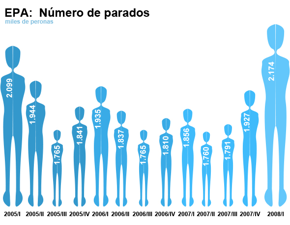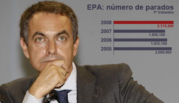 En concreto, la tasa de desempleo no alcanzaba un porcentaje de esta naturaleza desde el primer trimestre de 2005, cuando llegó a situarse en el 10,19 por ciento. El vicepresidente económico, Pedro Solbes, ya ha advertido de que en los próximos dos años la tasa de paro se moverá entre el 9 por ciento o el 10 por ciento, en el peor de los escenarios. Según los datos del INE, en los últimos doce meses, el paro acumula una subida de 318.100 desempleados (17,1 por ciento), mientras que el número de ocupados se ha incrementado en 333.000 personas, lo que supone un aumento porcentual del 1,6 por ciento.