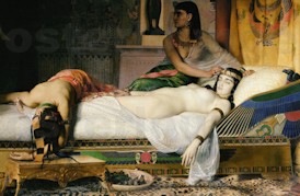 Marco Antonio y Cleopatra, que se tradujo en la muerte de ambos en un episodio que aún está teñido de incógnitas, sobre todo en el caso del suicidio de la reina egipcia, cuyas circunstancias “siguen siendo todavía un gran misterio, tanto por la aparente facilidad con la que encontró la ocasión para cometerlo como por la naturaleza misma del instrumento”, ya que no se sabe a ciencia cierta si utilizó una aguja impregnada en un veneno que mantenía oculto en una de sus joyas o si se hizo morder por un áspid.