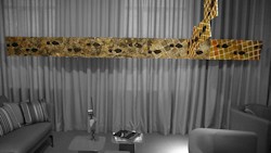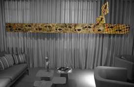 comedor de ambiente oriental, buscando una conexión con el universo. En un salón de línea urbana coloca un paseo fantasmal en el otoño de la ciudad. Huellas marcadas sobre las hojas invitan a seguir el camino de un cuadro sorprendente, en un formato desacostumbrado por su radical horizontalidad.