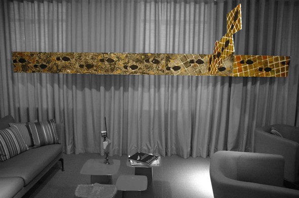 tornillos, uno de los símbolos recurrentes en la obra de este artista, esta vez quedan plasmados sobre zinc. Y desde esa posición, charlan con las sillas en acero de la sala de juntas. Mientras, sobrevuelan moscas metálicas, otro tema muy español que Alcázar toma prestado de Arroyo.