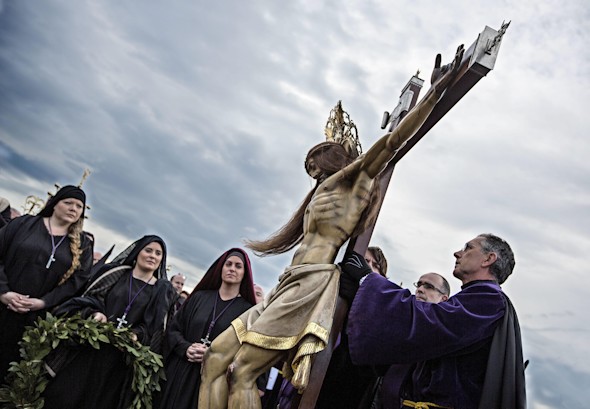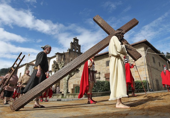 Viernes Santo. En otros lugares la lluvia ha dado paso al sol, como por ejemplo en la localidad vizcaína de Balmaseda, donde miles de personas han presenciado el Vía Crucis viviente, uno de los actos de Semana Santa más populares del País Vasco.