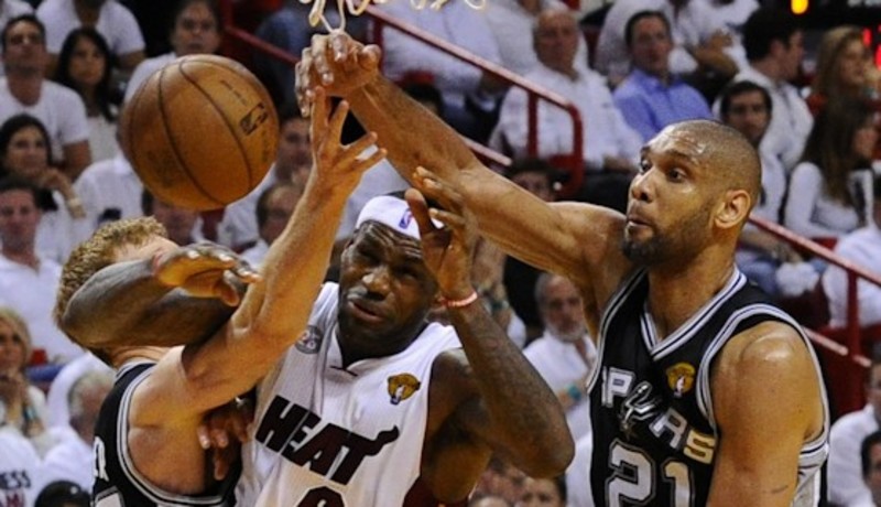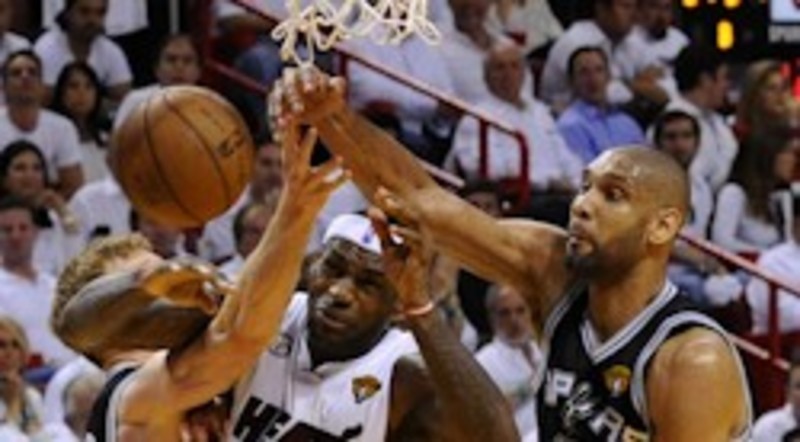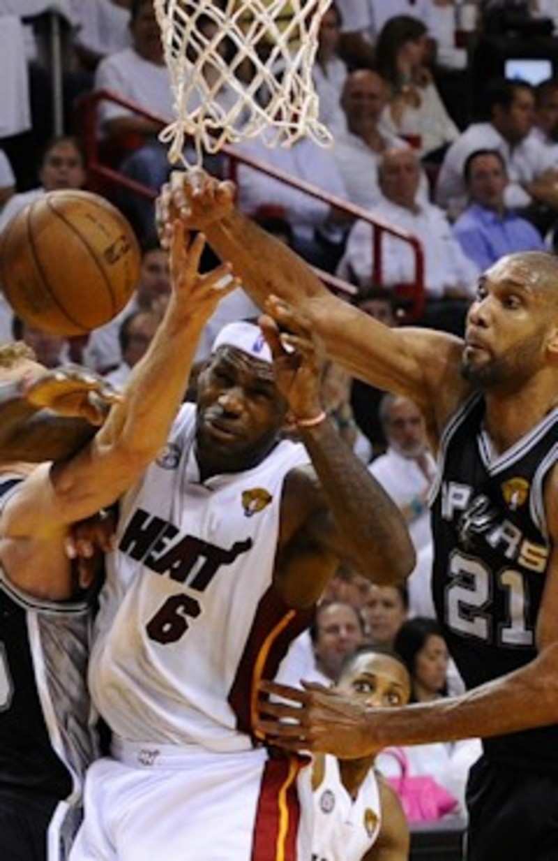 La estrella de los Heat anotó 7 de 16 tiros de campo y se quedó con la puntuación más baja que ha logrado en lo que va de competición de la fase final. El escolta Dwyane Wade aportó 17 puntos (7-15, 0-0, 3-4), pero no consiguió ninguno en el cuarto periodo, mientras que el pívot Chris Bosh y el veterano escolta Ray Allen anotaron 13 tantos cada uno. Allen hizo su mejor partido ofensivo de la fase final al anotar 3 de 4 tiros de campo que fueron todos triples y 4 de 5 desde la línea de personal. Pero Bosh (6-16, 0-4, 1-2) volvió a tener poco protagonismo en el juego dentro de la pintura, donde los Heat consiguieron 34 puntos por 40 de los Spurs y Duncan le ganó el duelo individual.