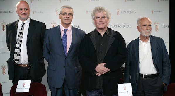 Acompañado de José Ignacio García Belenguer, director general del Teatro Real, Joan Oller, director general del Palau de la Música Catalana, y Alfonso Aijón, Presidente de Ibermúsica, el famoso director de orquesta británico ha querido atender a los medios antes de “concentrarse” en esta gira española al frente de la prestigiosa orquesta de Berlín y que dará inicio mañana miércoles en el teatro de la Plaza de Oriente con la Novena Sinfonía de Beethoven. No era, sin embargo, la grandiosa obra del compositor alemán lo que estaba programado para su segunda visita al Real tras el Concierto de Europa el 1 de mayo de 2010, pero sir Simon ha explicado cómo llegaron – Gerard Mortier y él mismo – a la conclusión de que ésta era la mejor opción, una vez que se confirmó la imposibilidad de representar La Flauta Mágica por problemas con el presupuesto, a causa de los recortes de las instituciones públicas. A juicio del maestro, la Novena tiene muchos elementos en común con la citada ópera de Mozart, que se refieren al carácter solidario de ambas y a su luminosidad, así como a la posibilidad de poder seguir contando con los solistas contratados para la ópera y también con el Coro Titular del Teatro Real, al que Rattle ha calificado de excelente. “Ya he tenido el primer ensayo con el coro y todo lo que me habían dicho es verdad”, ha afirmado.