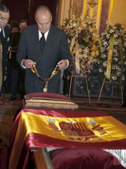 Minutos después, Don Juan Carlos ha depositado emocionado sobre el féretro de Calvo Sotelo el Collar de la Real y Distinguida Orden de Carlos III.