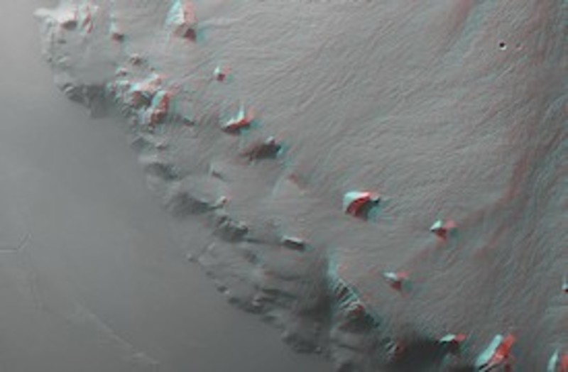 9 kilometros de altura. Probablemente se formó durante una serie de deslizamientos de tierra catastróficos sobre los flancos del volcán, en la que los escombros resultantes se transportaron varios cientos de kilómetros más allá de la extensión de estas imágenes. Los flujos de lava cubren la base del volcán, salpicado por un puñado de bloques puntiagudos y de cima plana, que resultaron levantados durante el colapso.