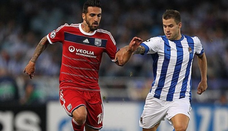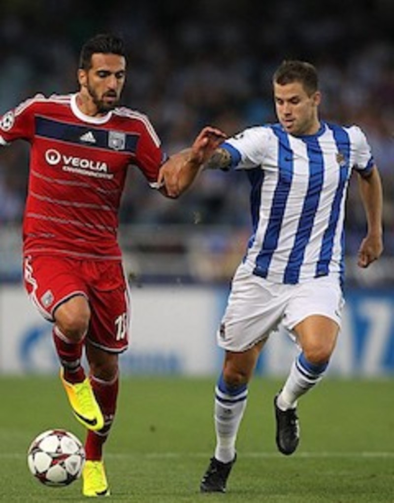 La Real estaba desmelenada y el conjunto francés noqueado aunque aguantaba de pie, a pesar de sufrir las acometidas locales una y otra vez y disponer la Real de claras oportunidades de gol, como las que tuvieron Griezmann y Vela en sus botas a la media hora de partido.