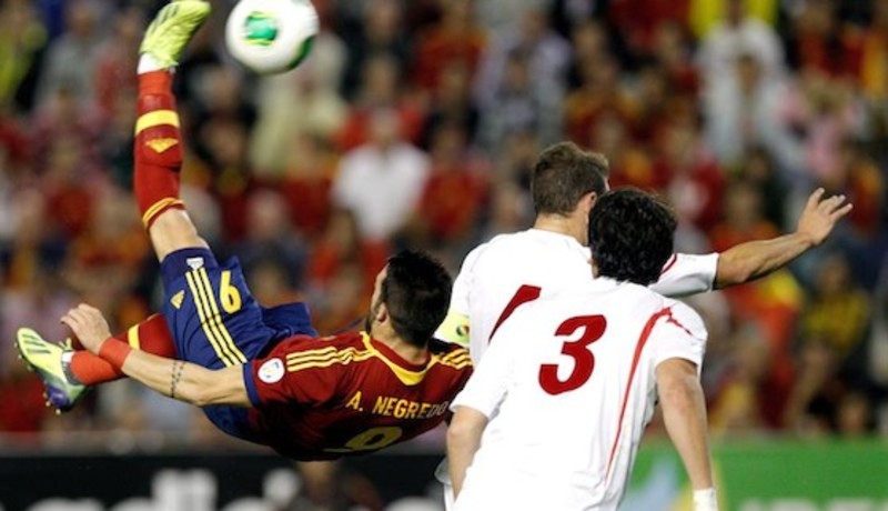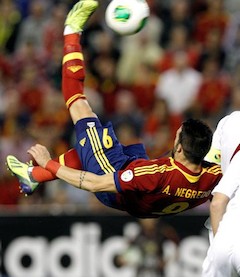 Pese a que la defensa de cinco suele dejar con pocas opciones al nueve, Negredo sobresalió del muro georgiano. Hizo trabajar a Loria, primero en un rechace a disparo de Pedro, posteriormente con una chilena fascinante desde la frontal del área que sacó con una buena estirada el portero georgiano, y al final encontró el premio del gol, tras combinación de Pedro e Iniesta, fusilando en carrera a la red.
