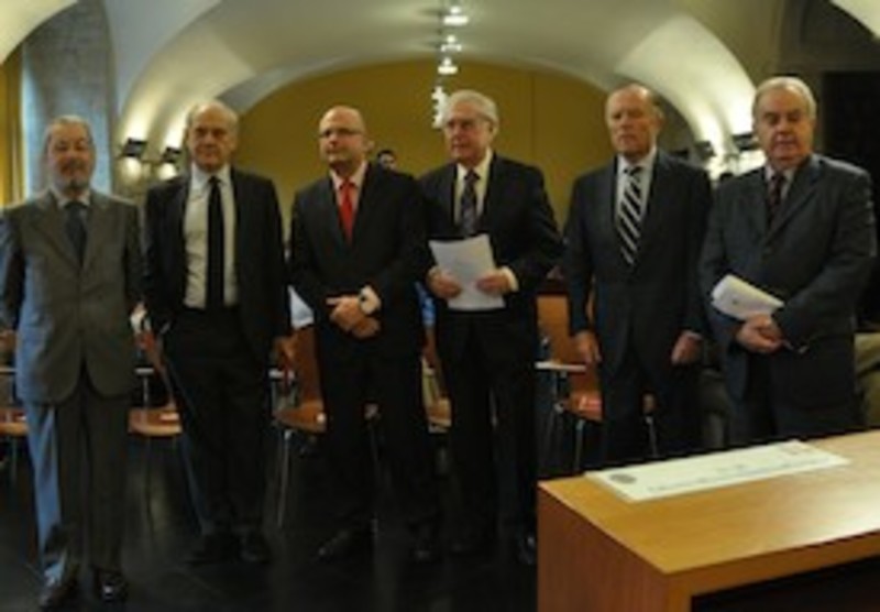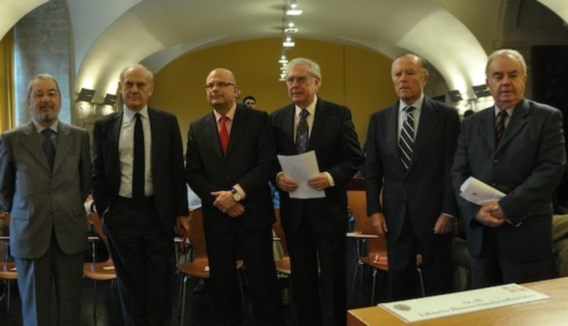 De izquierda a derecha: Liborio Hierro Sánchez, Tomás de la Quadra Salcedo, Fernando Martínez Vallvey, Javier Rupérez, Ignacio Camuñas y José Varela OrtegaActo de inauguraciónEl director del Centro de Estudios Políticos y Constitucionales, Benigno Pendás, el embajador de España Javier Rupérez y el rector de la Universidad Pontificia de Salamanca, Ángel Galindo, apostaron en la presentación por aplicar ahora el espíritu con el que se fundó la revista "Cuadernos para el Diálogo", que cumple ahora su cincuentenario.