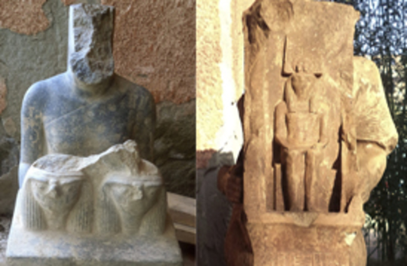 El jefe del Departamento de Egiptología, Mohamed Abdel Maqsud, señaló que el sacerdote está aferrado a una mesa de ofrendas que tiene dos cabezas de halcones, que representa a Montu, y tiene grabados textos religiosos escritos en alfabeto jeroglífico. La segunda pieza, de caliza, es de una dimensión algo superior y muestra a uno de los grandes escribas del templo sosteniendo un sarcófago y una estatuilla de Montu.