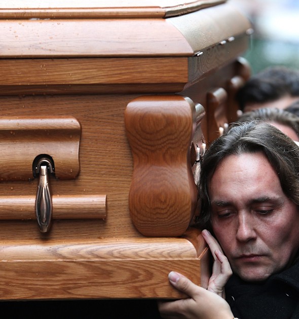 El coche fúnebre traslada el féretro, seguido por otros dos vehículos que portan las innumerables coronas de flores llegadas desde diversos puntos. Pese a que la familia expresó su deseo de enterrar a