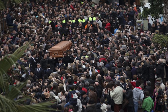 Algeciras despide a Paco de Lucía. Efe.El féretro fue recibido con palmas y vítores a la salida del templo por cientos de personas y por una escolta del cuerpo de Policía de Algeciras formada junto al coche fúnebre. Acompañado del repique de campanas, el vehículo ha partido entre aplausos hacia el antiguo cementerio municipal donde, pese a la pertinaz lluvia, miles de vecinos se han congregado para darle el último adiós a su paisano.