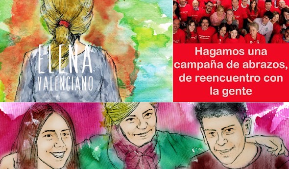 El Partido Socialista enfoca la campaña de Elena Valenciano a las europeas desde una perspectiva pretendidamente emocional. El primer vídeo conocido contiene imágenes con filtro de acuarela y distintas palabras como "sueños", deseos", "derechos", "libertad" o "igualdad". También "abrazos". En una de las imágenes de mayor recorrido por las redes sociales (arriba a la derecha), era esa su intención, Valenciano propone "una campaña de abrazos". Así lo está haciendo con muchos simpatizantes, que más tarde comparten las fotografías. Ferraz llama a los jóvenes, uno de los bloques de electores a los que más costará movilizar, y les promete "trabajo" y "futuro".