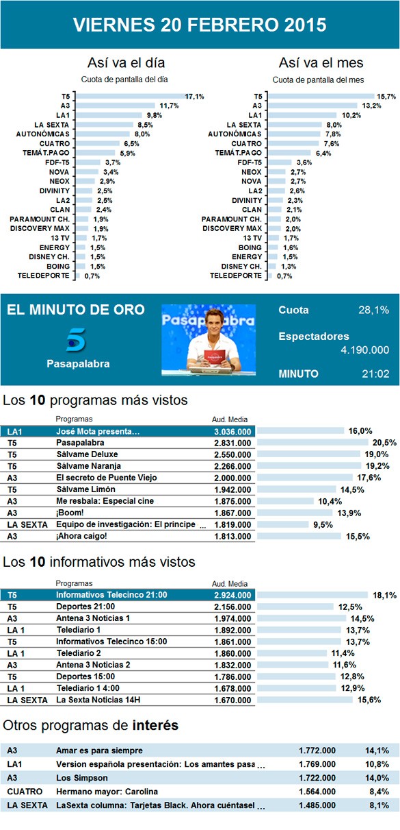 Tras dar el bote del concurso, Pasapalabra ha empezado de nuevo sin perder comba en lo que a índices de audiencia se refiere. El espacio de Telecinco copó el minuto de oro, pero la emisión más vista del viernes fue para el espacio de humor de la Primera José Mota presenta... Por detrás, las dos ediciones de Sálvame.
