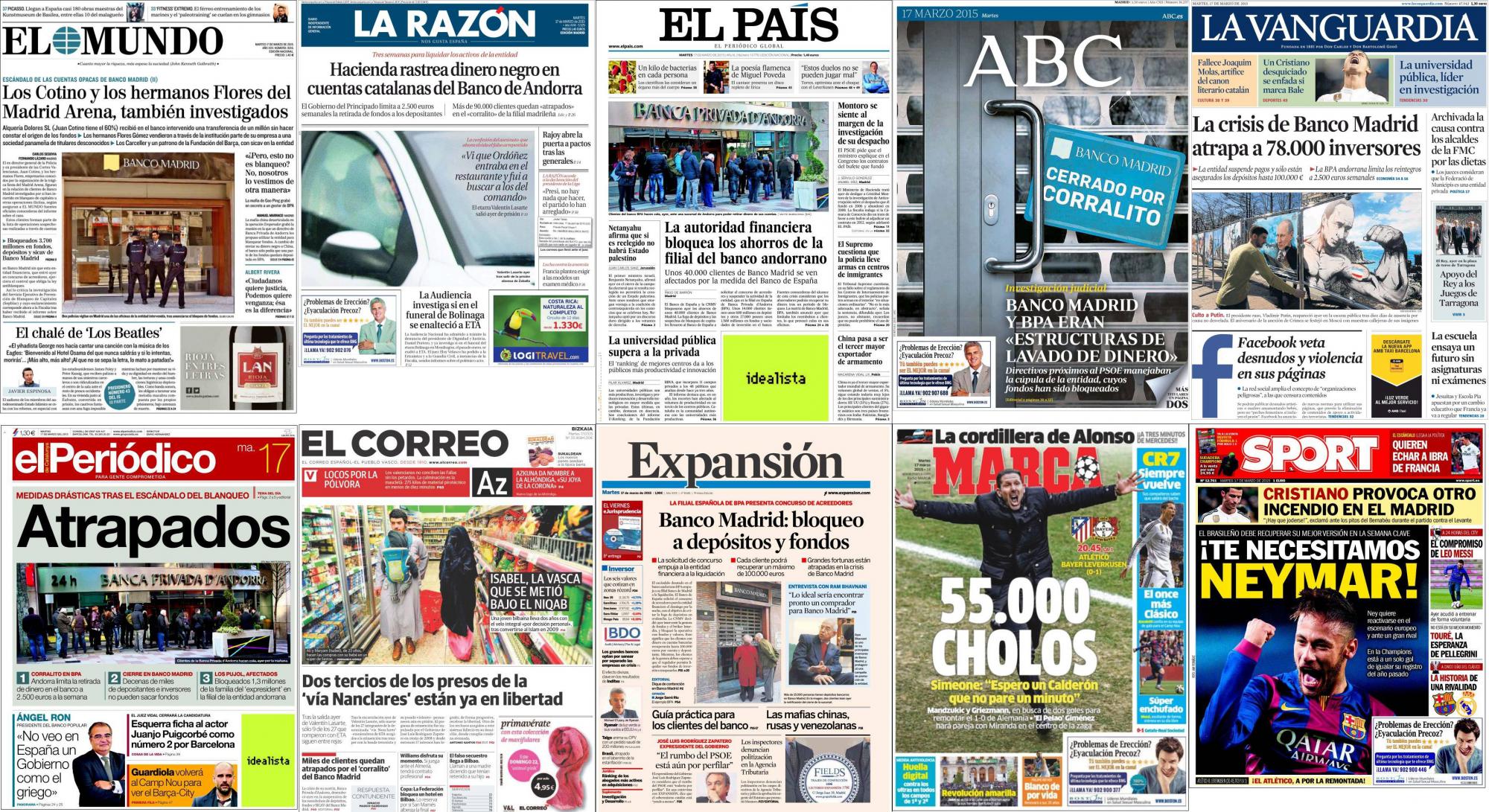 ABC, sobre Banco Madrid: “Cerrado por corralito”. Titula que esta entidad y BPA eran “estructuras de lavado de dinero”. Y añade que “directivos próximos al PSOE manejaban la cúpula de la entidad, cuyos fondos han sido bloqueados”.