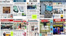 El Mundo anuncia la segunda parte del escándalo de las cuentas opacas de Banco Madrid: “Los Cotino y los hermanos Flores del Madrid Arena, también investigados”. En un sumario explica que quedan bloqueados 3.700 millones en fondos, depósitos y sicav de Banco Madrid. La foto es para dos policías vigilando la entidad intervenida. Además, una grabación de Gao Ping a un gestor de BPA: “¿Pero, esto no es blanqueo? No, nosotros lo vestimos de otra manera”. Una entrevista con Albert Rivera: “Ciudadanos quiere justicia, Podemos quiere venganza; ésa es la diferencia”, y una nueva entrega del reportaje de Javier Espinosa sobre su cautiverio a manos del EI.