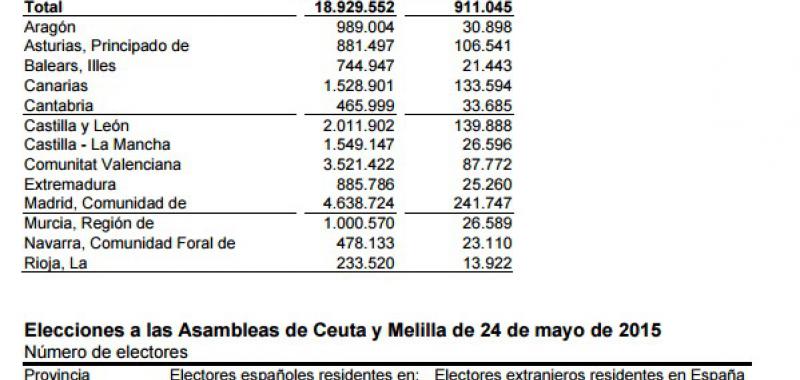 Para las elecciones municipales podrán votar 34.985.499 electores mientras que para las autonómicas serán 19.840.597 y 119.447 para elegir las Asambleas de Ceuta y Melilla. De entre todos ellos, 463.765 son extranjeros residentes en España.